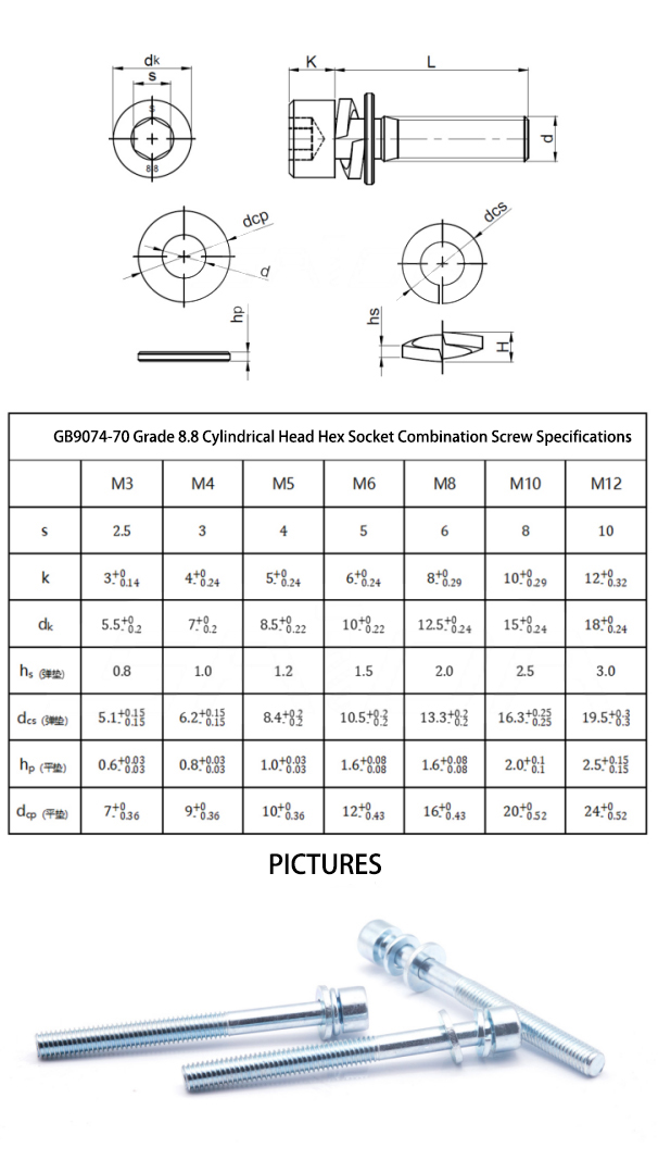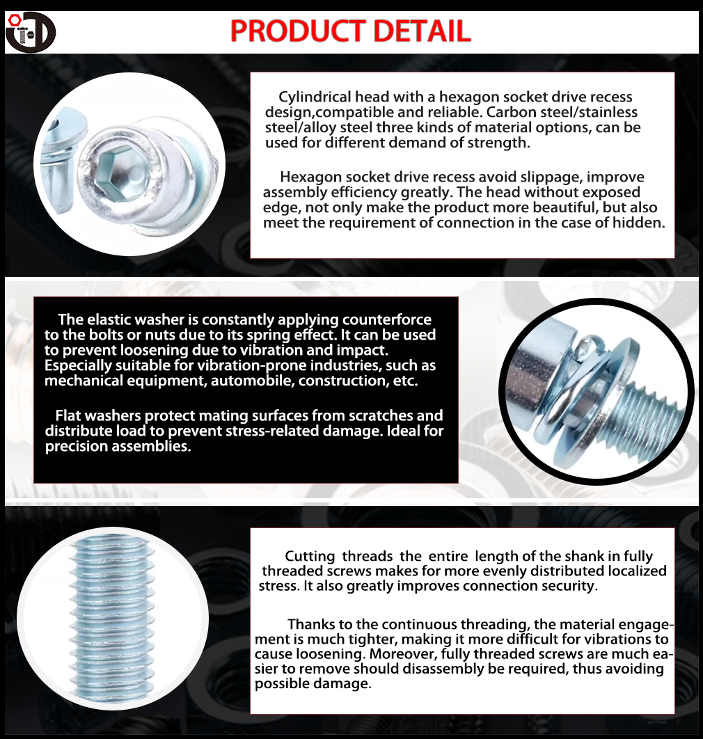 সিলিন্ডার হেড হেক্স সকেট ত্রি-গ্রিপ স্ক্রু উচ্চ টর্ক ট্রান্সমিশন এবং লো-প্রোফাইল ইনস্টলেশনগুলিতে ছাড়িয়ে যায়, এর যথার্থ হেক্স সকেট ড্রাইভ এবং নলাকার মাথা নকশার জন্য ধন্যবাদ। ইন্টিগ্রেটেড ত্রি-উপাদান কাঠামো (স্ক্রু + ফ্ল্যাট ওয়াশার + স্প্রিং ওয়াশার) কম্পন প্রতিরোধের আলগা এবং বাড়ানো প্রতিরোধের সময় সমাবেশকে সহজতর করে, এটি গতিশীল লোড অ্যাপ্লিকেশনগুলির জন্য আদর্শ করে তোলে। যন্ত্রপাতি উত্পাদন, স্বয়ংচালিত শিল্প, ইলেকট্রনিক্স এবং যথার্থ যন্ত্রগুলিতে ব্যাপকভাবে ব্যবহৃত হয়, এটি উচ্চ-ফ্রিকোয়েন্সি বিচ্ছিন্ন বা সমালোচনামূলক সংযোগের জন্য নির্ভরযোগ্য সমাধান সরবরাহ করে।
